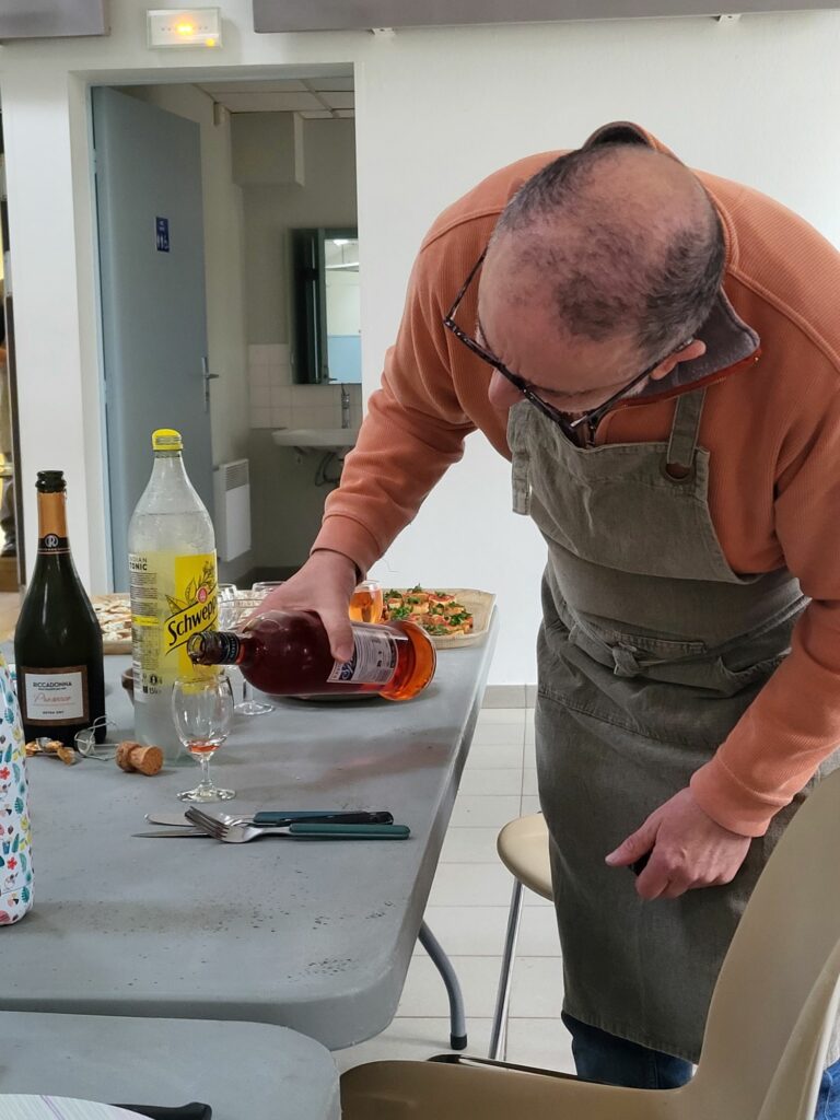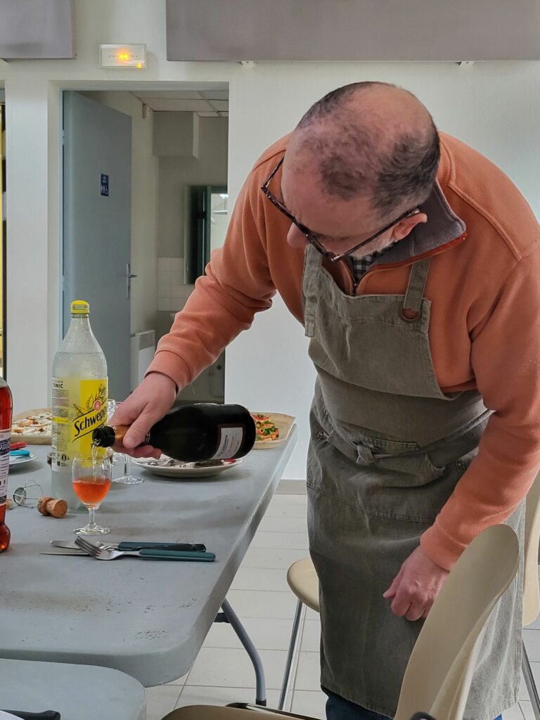 Christophe Andrivet ouvre les bouteilles de vin puis nous prépare un Spritz pour l’apéritif.